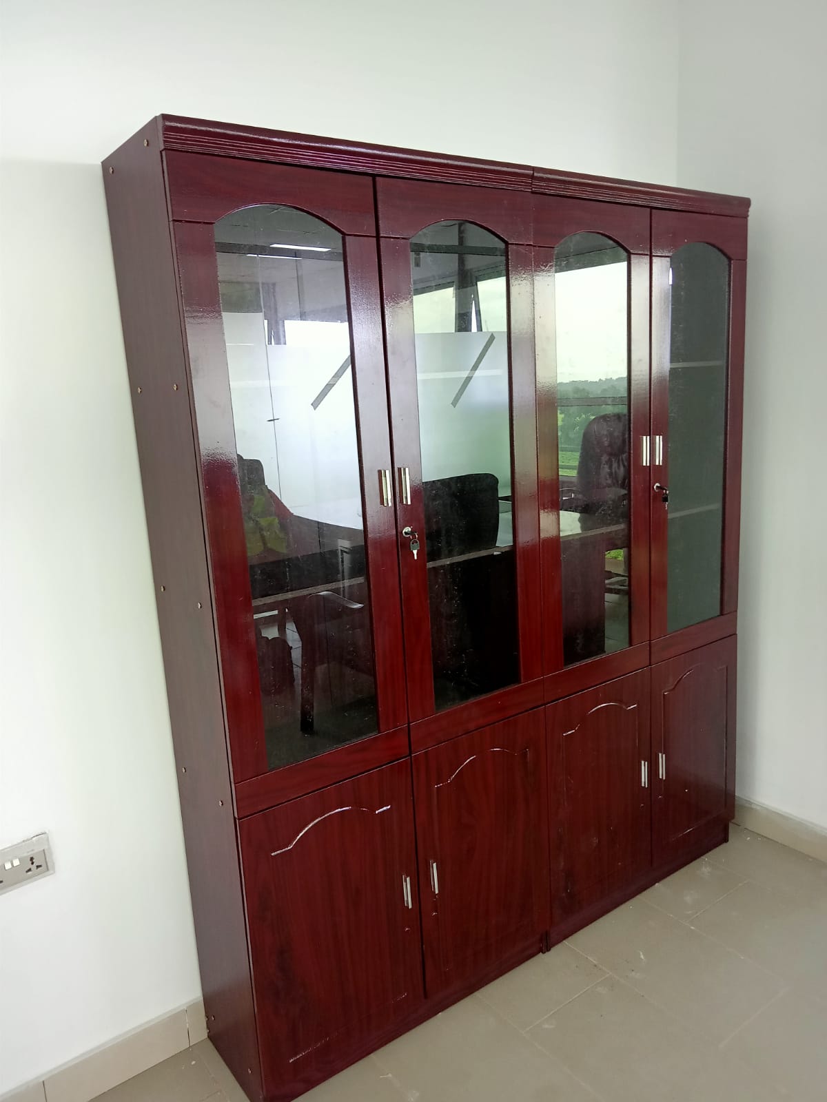 An executive 3-door glass wooden bookshelf is a sophisticated and functional piece of furniture that combines elegant design with practical storage. It typically features a wooden frame for durability and glass-paneled doors for a sleek, professional look, making it ideal for executive offices, libraries, or home studies.