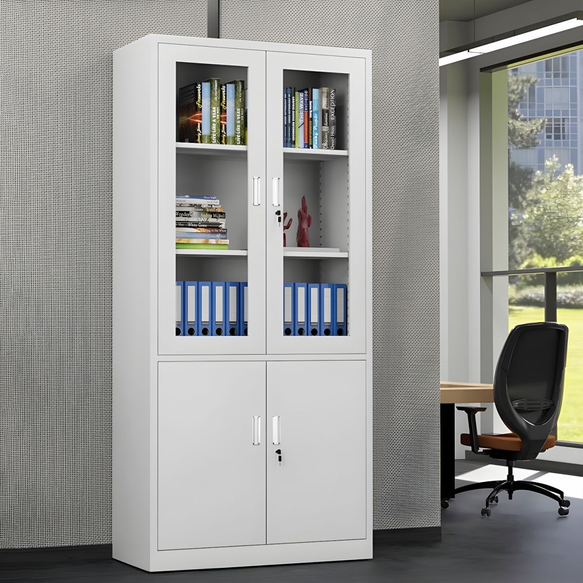 A 4-door half glass metallic cabinet is a storage unit made from metal ( steel), designed with four doors, where the upper portion of each door includes glass panels.