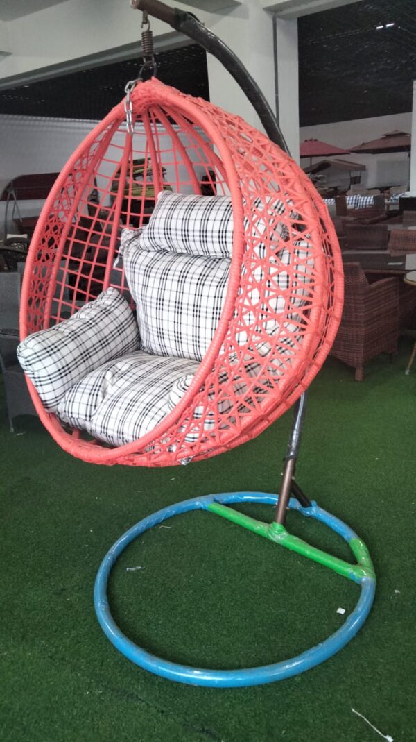 – Hanging Mechanism: The swing chair is suspended from a sturdy overhead support, such as a ceiling, a tree branch, or a specially designed stand. It is typically attached with ropes, chains, or metal hooks that allow it to swing freely.